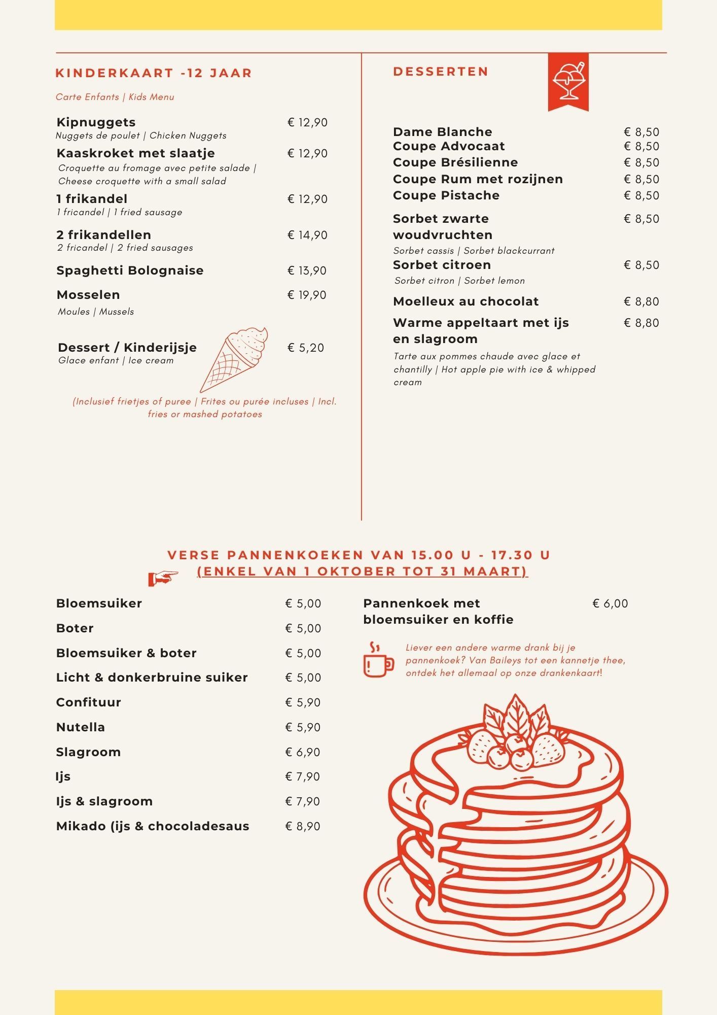 Op onze kaart staan onder meer heerlijke visgerechten, stoofvlees, speciaalbieren en meer, dat ons kleine land te bieden heeft. Gaat u liever voor iets zoets? In onze gezellige tearoom serveren we verrukkelijke zoetigheden en kunt u, gedurende de wintermaanden, genieten van versgebakken pannenkoeken.